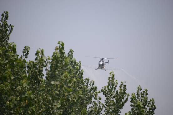 7月14日上午,bet5365官网与四川驼峰通用航空有限公司合作,使用大型直升飞机进行杨树病虫害防治。根据夏邑国家级中心测报点技术人员监测调查,以杨小舟蛾为主的杨树食叶害虫已进入第3代低龄幼虫期,兼有部分卵块,全县发生面积2万亩,多为轻中度发生。根据县气象台天气趋势分析,近两天天气晴好,风速1-2级,适合使用飞机大面积防治作业。上午9点森防技术人员和飞防公司人员一道,冒着38度的高温,配药加药,开始对该县境内连霍高速、商永北路、杨业路、骆通路、商永南路等五条主要廊道杨树实施飞机防治,在飞防的同时,中心测报点技术人员进行接雾滴调查。